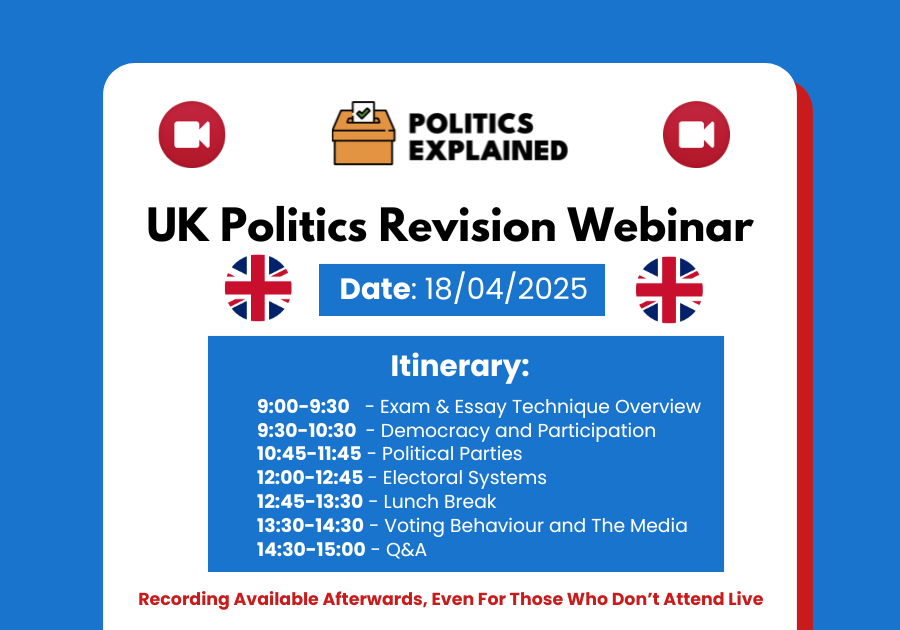 On Friday 18th April, Politics Explained will be running a 5 hour long revision webinar for the UK Politics section of the first Edexcel A Level Politics exam. It will be focused around preparing you really well for the questions that are most likely to come up in this year's exam. You can sign up here.