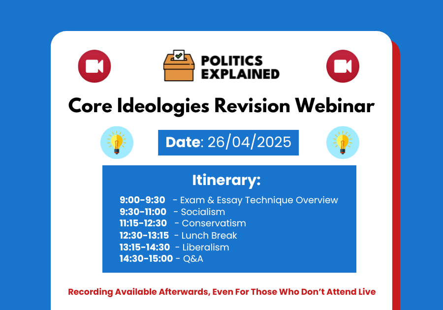 On Saturday 26th April, Politics Explained will be running a similar webinar for the core political ideas section of the first Edexcel A Level Politics exam. You can sign up for that here.
