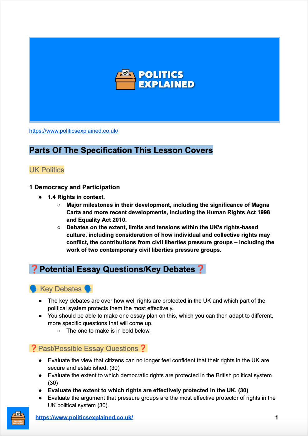 In this PDF, there is everything you need to know about Rights In Context to get an A* in A Level Politics! This accompanies a free video on the Politics Explained YouTube Channel.